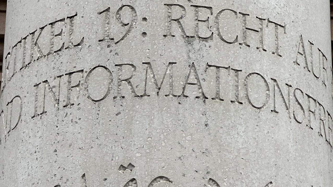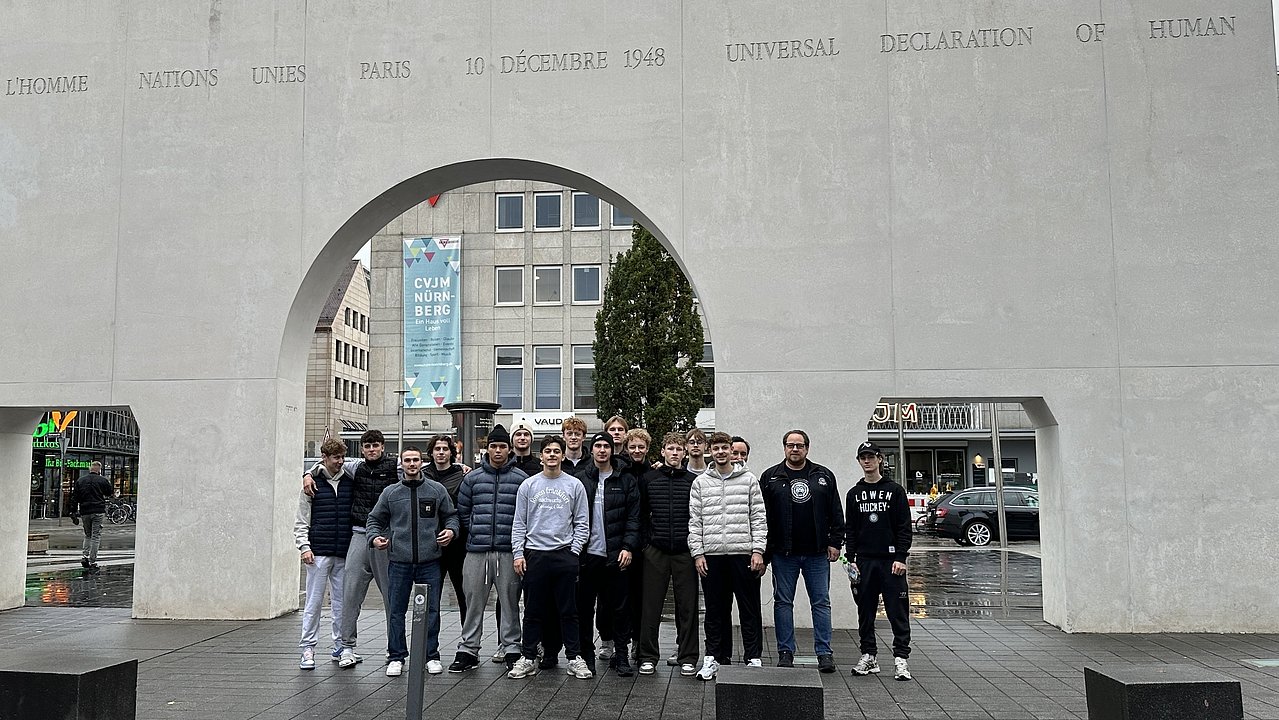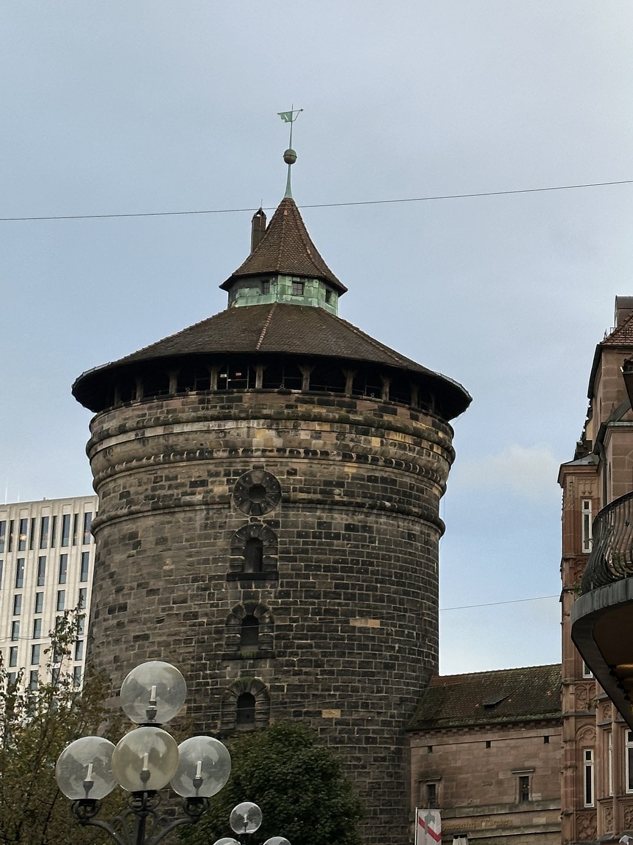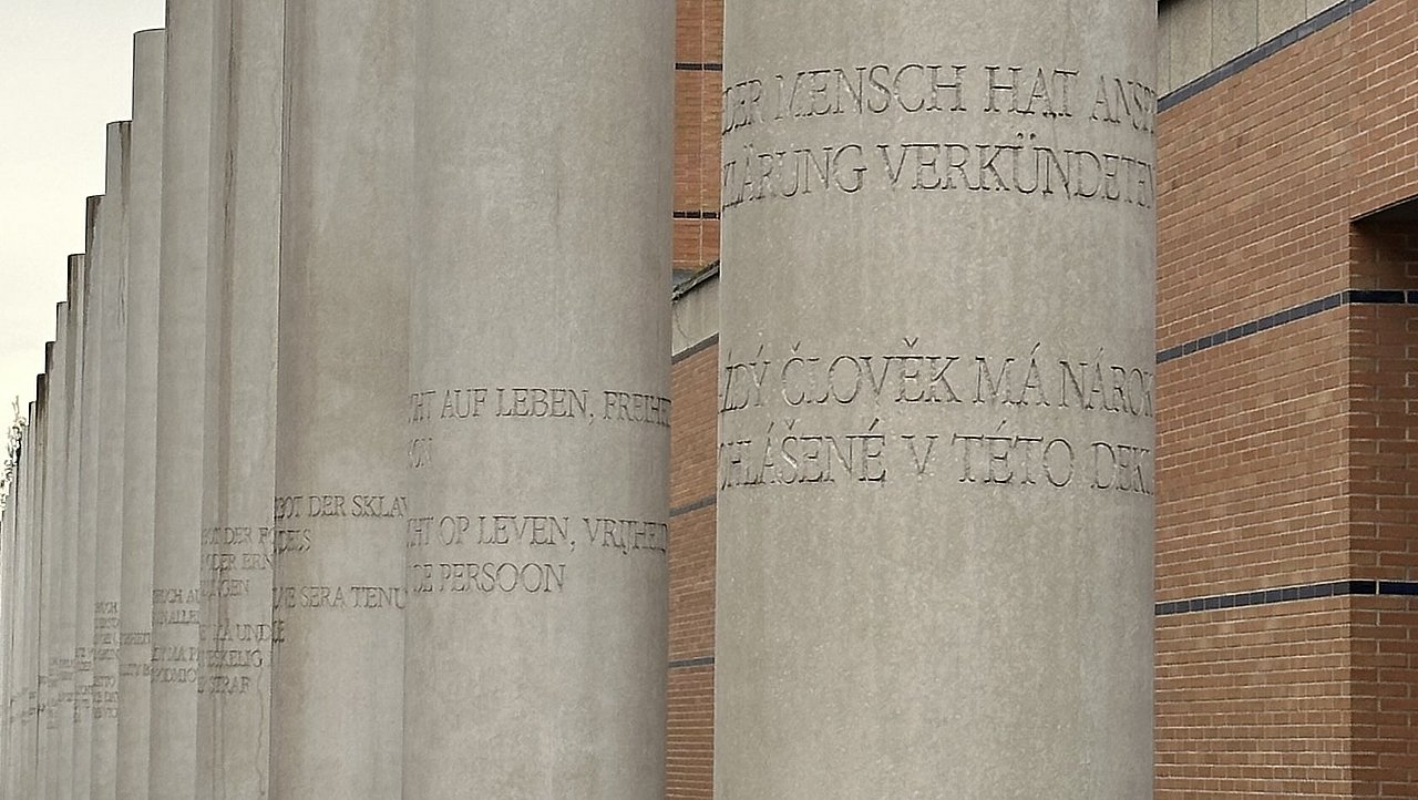 Der Rundgang durch die Nürnberger Altstadt startete an der Straße der Menschenrechte, welche ein öffentliches Kunstwerk und Mahnmal ist, das an die universellen Menschenrechte erinnert. Entlang einer schmalen Passage zwischen Königstor und Ochsengasse stehen 30 weiße Säulen, auf denen jeweils ein Artikel der Allgemeinen Erklärung der Menschenrechte in deutscher und in einer weiteren Sprache eingraviert ist. Die klare, schlichte Gestaltung schafft einen nachdenklichen Raum mitten in der Stadt.